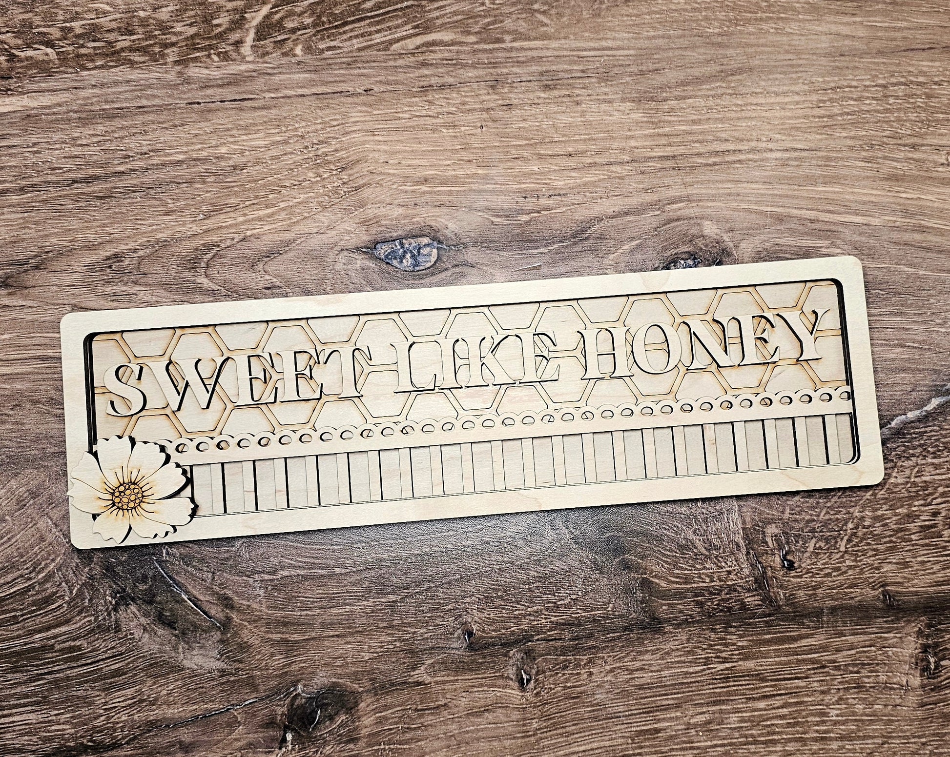 Make your home sweeter with our Sweet Like Honey Chunky Shelf Sitter. This rustic 5"x16" piece features charming bees and blooms, perfect for adding character to your shelves. With 4 separate layers, it's easy to paint and create a unique design. Buzz with creativity and make a statement today!