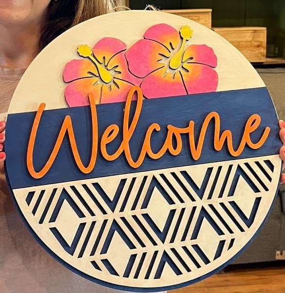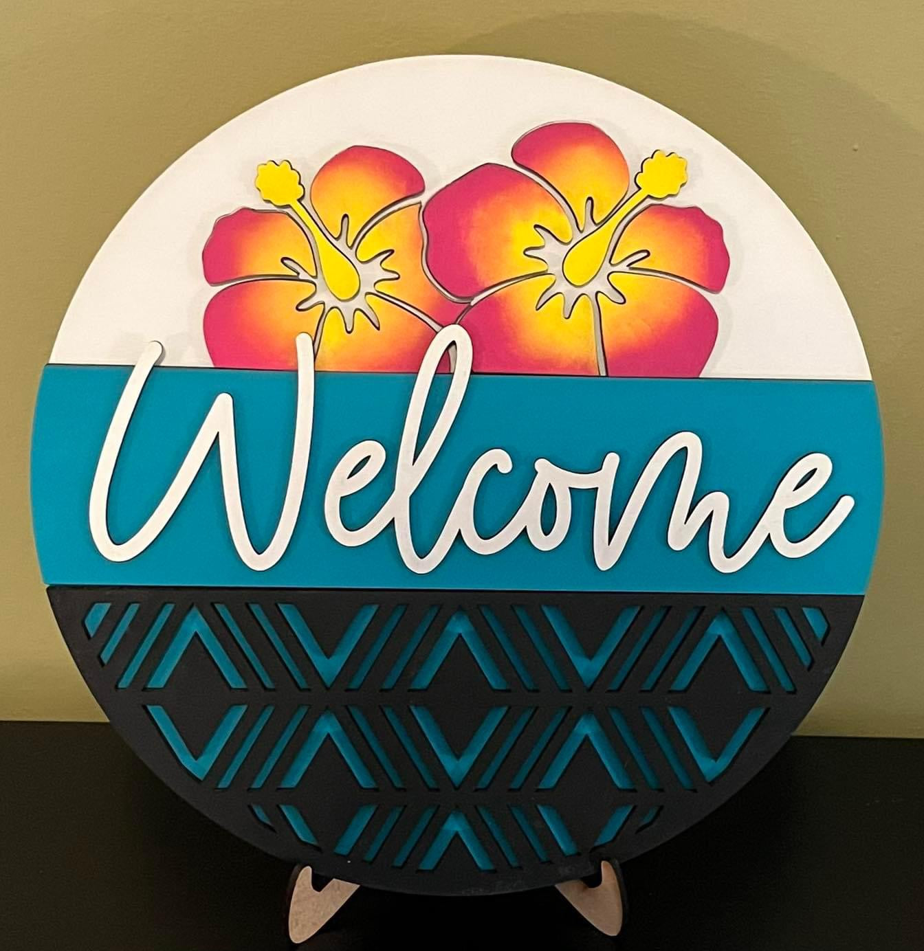 Our Welcome sign features vibrant Hibiscus flowers to brighten up any space. Perfect for adding a warm and inviting feel to your home or sunroom.