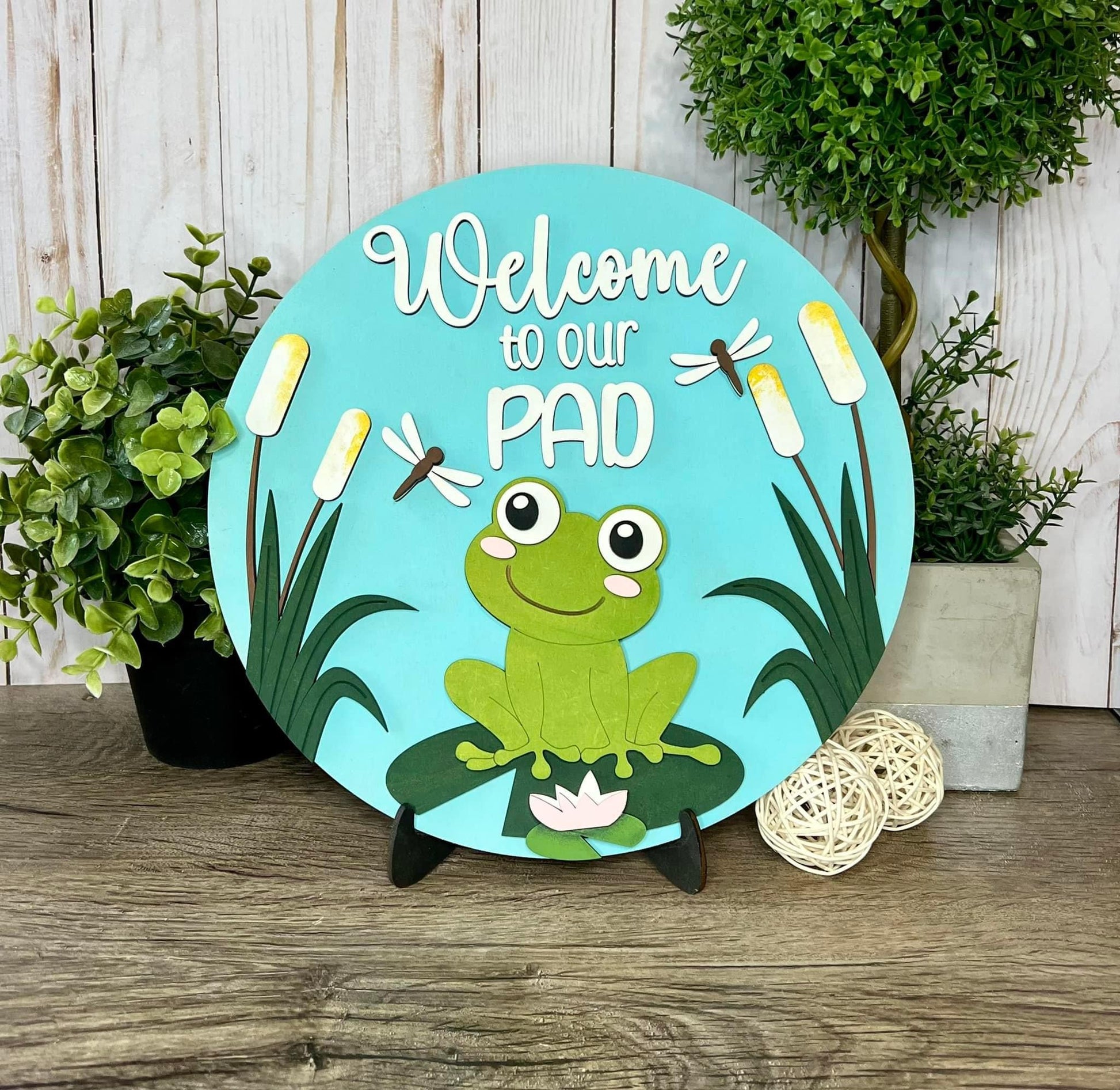 Welcome guests with a froggy hello on our "Welcome to our Pad" sign! Perfect for adding a quirky touch to your home, this sign features a friendly frog and a playful pun. Get ready to make your guests ribbit with laughter!